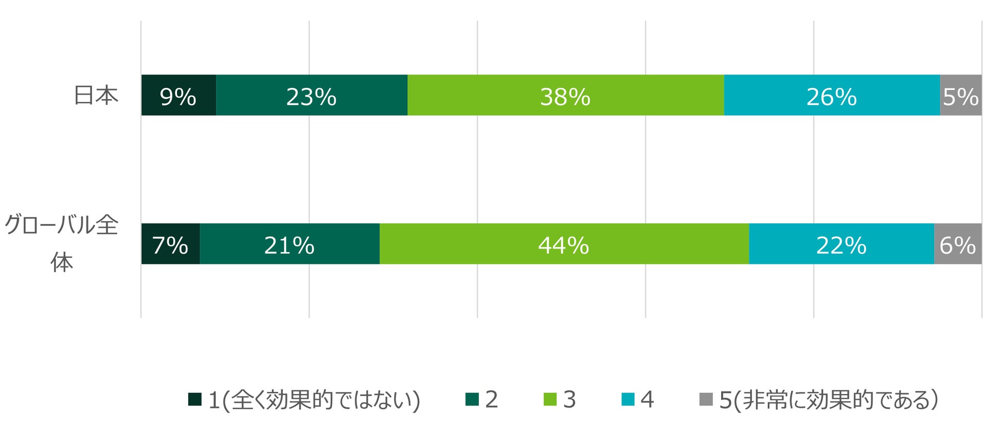 4. DE&I先進企業と後進企業の二極分化自組織のDE&Iの取り組み効果の度合いを5段階で評価してもらった結果、日本の回答とグローバルの回答ともに「効果があった(4, 5)」、「効果的ではない(1, 2)」と回答した割合がそれぞれ約30%程度であった。国内外ともに、DE&Iの取り組みにおいて効果を上げている企業と、そうではない企業の二極分化が進んでいることが伺える。