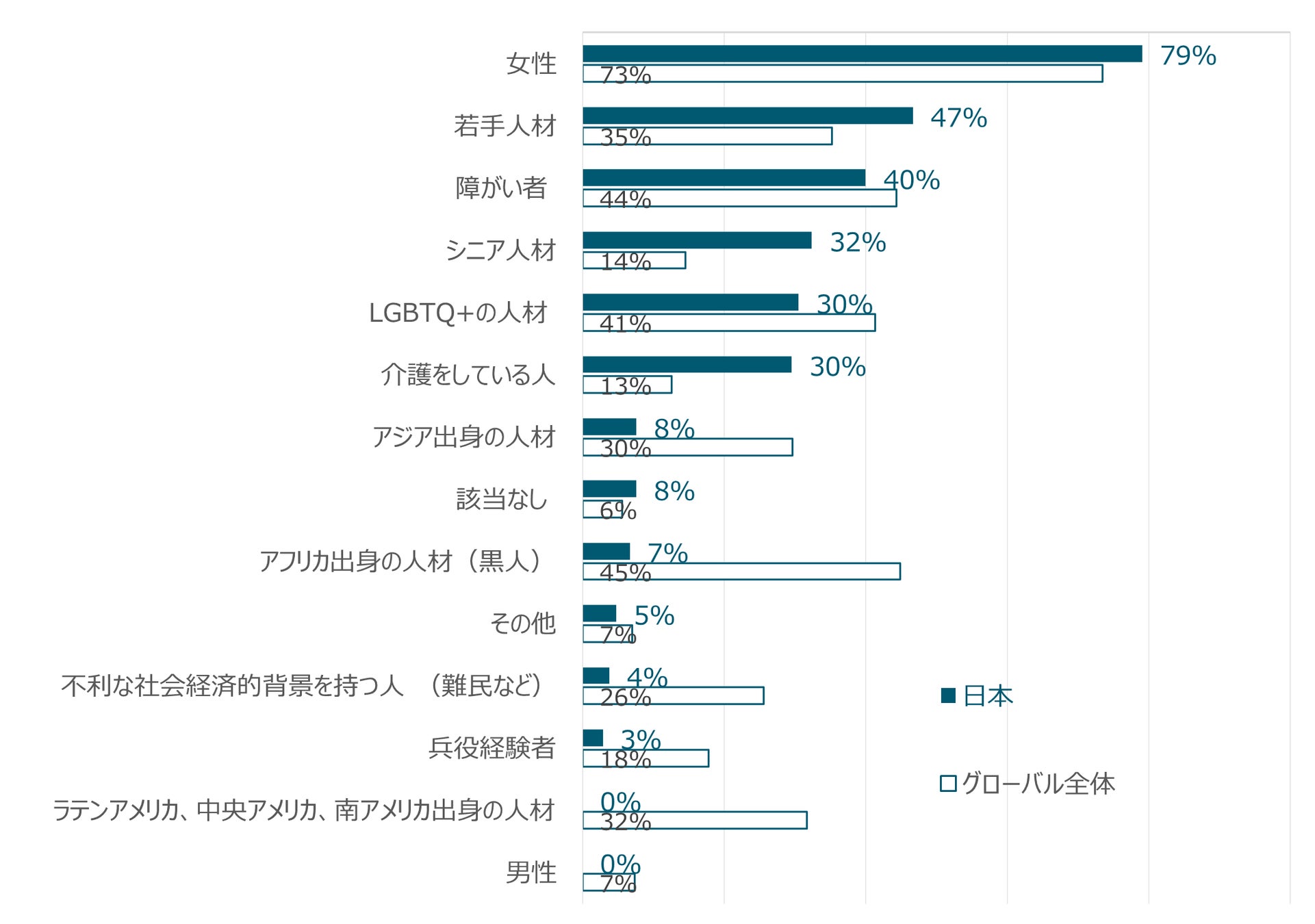 2. 女性だけではない、過小評価されがちな人材組織において優先事項となっている「過小評価されがちなグループ」については、グローバル全体と日本の結果は共通して「女性」がトップとなった。また、日本の回答上位5項目に「若手人材」と「シニア人材」が入った。超高齢化社会を迎える日本において双方のバランスをとる難しさが伺える。その他に過小評価されているグループとして、「中途社員」「学歴」をあげた日本の回答者がいたのは日本独特の傾向となった。