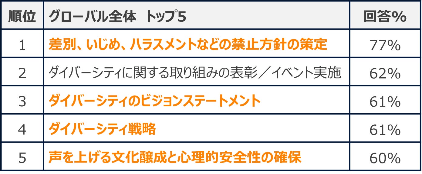 3. DE&Iは言うは易く行うは難し「導入済み、または導入予定のDE&I施策」について、日本もグローバルもトップになったのは「差別、いじめ、ハラスメントなどの禁止方針の策定」。その他、ダイバーシティ戦略を設定、公表し、職場ルールを設け、雰囲気を醸成するといった土台となる基本的取り組みについては、6~7割が導入済み、または導入予定と回答している。一方で、戦略を実行可能な単位に落とし込み、社員の行動を実際に変えていくことの難しさは、日本もグローバル全体も共通した課題となった。▼DE&Iの施策の実施状況は?