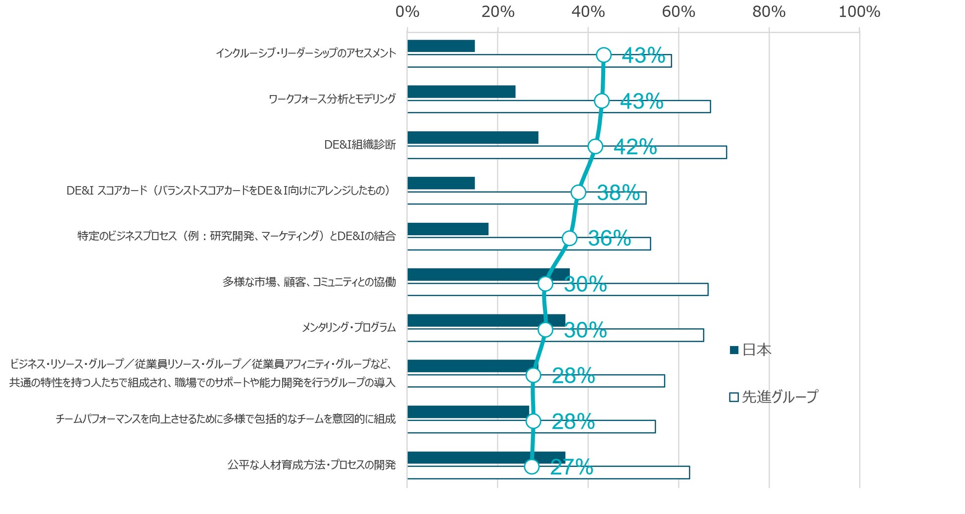 7. 現状分析から始めよDE&I推進グループの6~7割は、アセスメントや診断ツールを活用したデータによる現状把握や分析を実施または実施予定である点、そして、DE&Iを組織の構造的プロセスにまで統合していく点などが、日本企業の取り組みの現状と大きく異なっている。