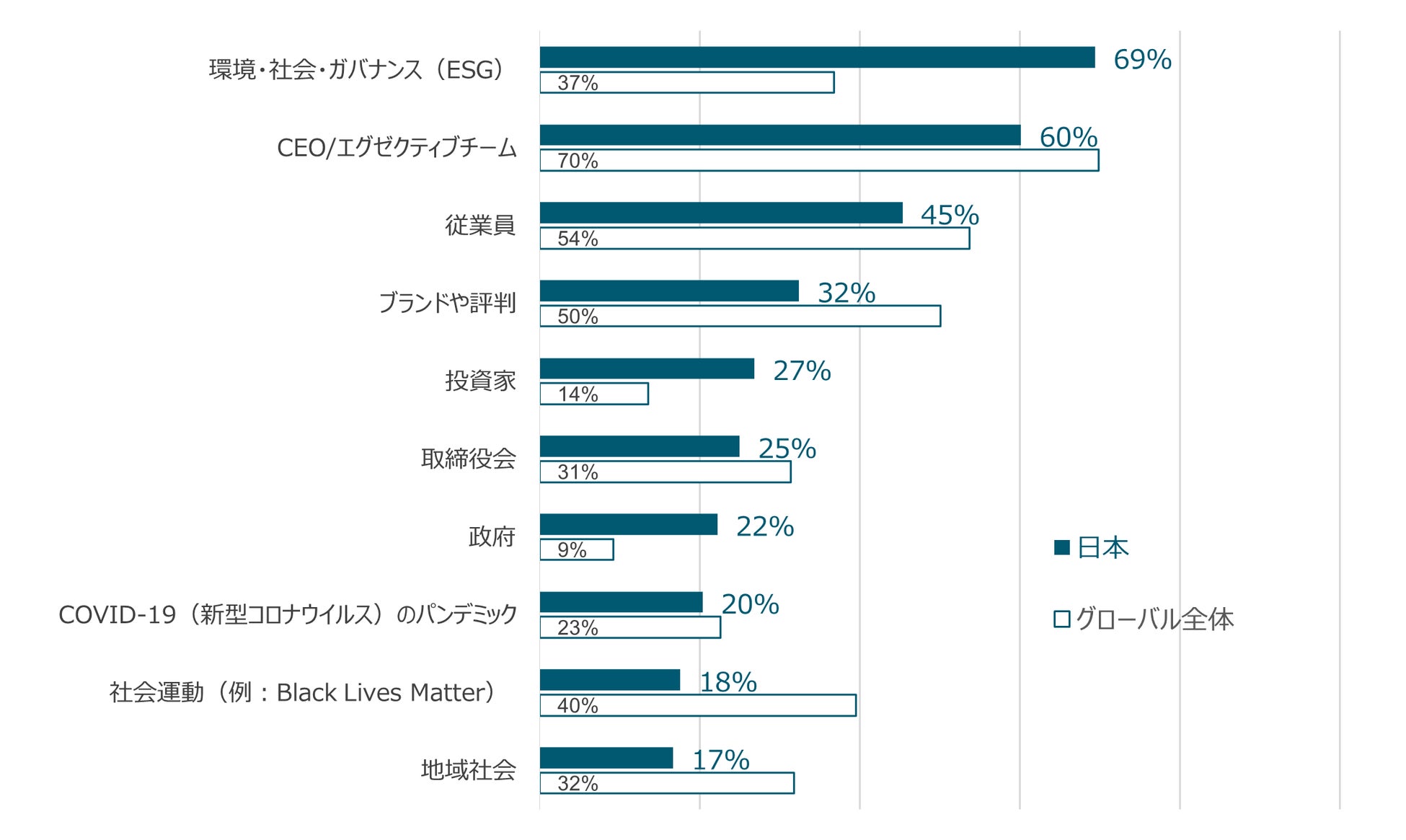 5. ESGという“外圧”>トップのコミットメント「DE&Iの取り組みが加速した」と回答した回答者に、加速した「きっかけ」について聞いたところ、日本企業から7割近くの回答を集めたきっかけのトップは「ESG」、次いで「CEO」であった。一方、グローバル全体、および地域別、日本以外国別のきっかけ第1位は「CEO」、ついで「従業員」であった。日本企業はESGが一種の“外圧”となっていることが分かる。