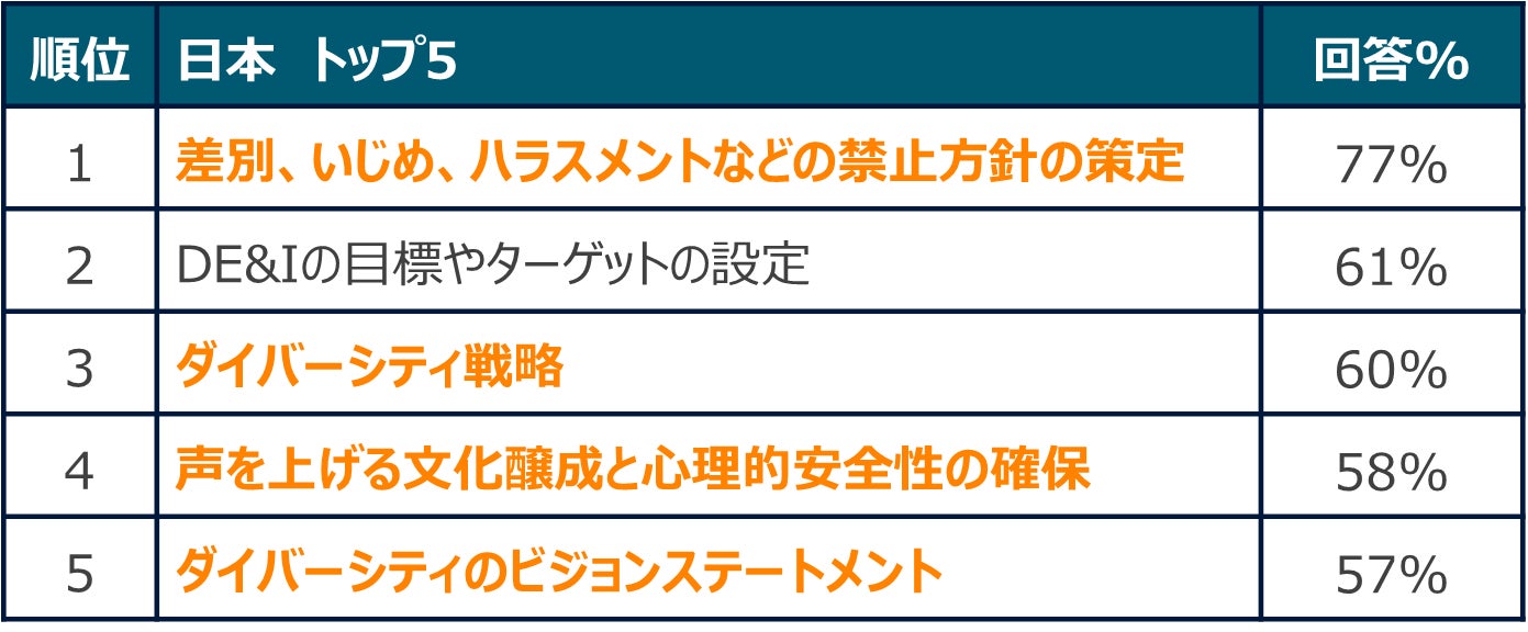 3. DE&Iは言うは易く行うは難し「導入済み、または導入予定のDE&I施策」について、日本もグローバルもトップになったのは「差別、いじめ、ハラスメントなどの禁止方針の策定」。その他、ダイバーシティ戦略を設定、公表し、職場ルールを設け、雰囲気を醸成するといった土台となる基本的取り組みについては、6~7割が導入済み、または導入予定と回答している。一方で、戦略を実行可能な単位に落とし込み、社員の行動を実際に変えていくことの難しさは、日本もグローバル全体も共通した課題となった。▼DE&Iの施策の実施状況は?